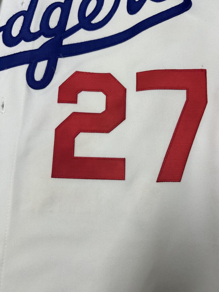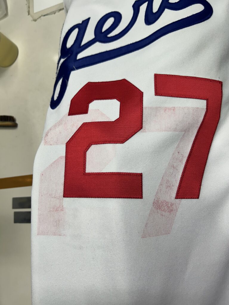 「野球のユニフォームの背番号を移動したら、元々貼っていた位置に赤いシールが残った」
